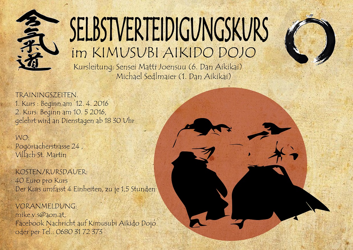 Das Kimusubi Dojo Villach bietet daher ab April 2016 spezielle Selbstverteidigungskurse unter der fachkundigen Leitung von Sensei Matti Joensuu (6. Dan Aikikai) und Michael Sedlmaier (1. Dan Aikikai) an.